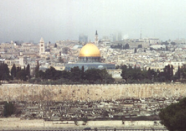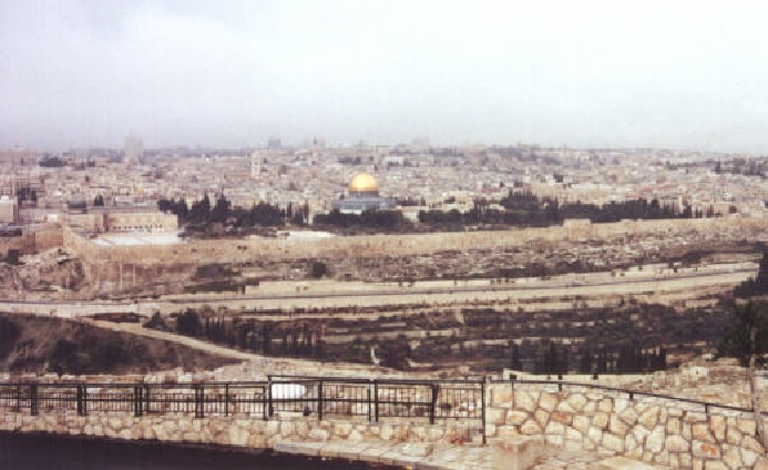 You will notice the dome of the Rock in the distance. It's got a gold dome right there. That's a muslim mosque that sits right on the spot that the temple used to be. You can see here that the buildings of Jerusalem are on the other side of the temple, and that was true in the time of Christ as well. Why? Because a wall is on this side of the temple keeping the city from growing out. Well, if you go exactly a Sabbath day's journey, you don't get to private houses in Jerusalem. You get to the temple. And it's just on the other side of the Old Jerusalem walls right here. And by the way – when a priest lit the signal fires, they did it after dark – the start of a new day. If that day happened to be a Sabbath, they could only travel as far as the temple and would have to spend the night.