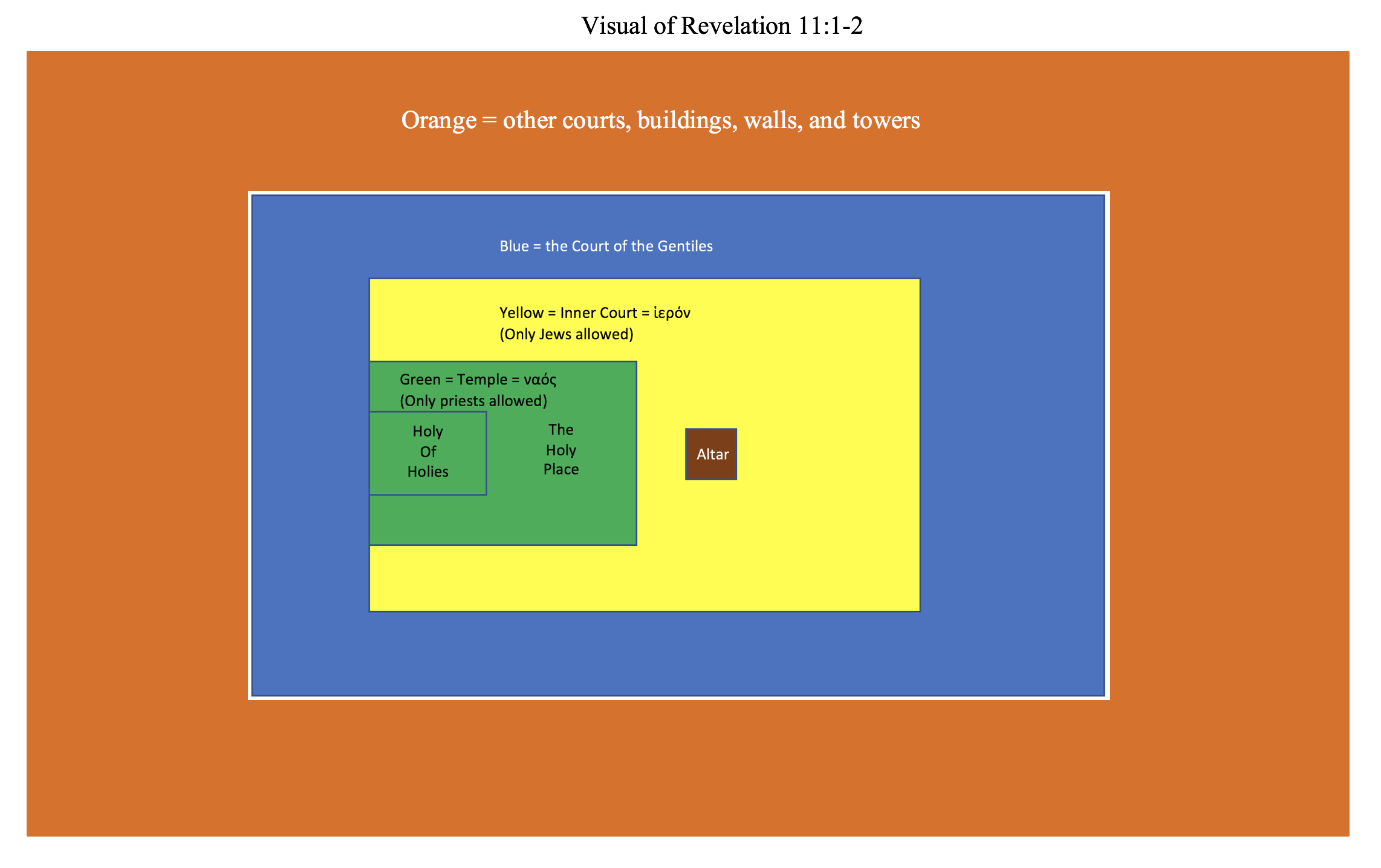 Third, the mention of "outer court" strongly implies that the ναός is the inner portion of the same structure - which it is on the literal temple. But I don't see how it could possibly be so on a non-literal temple. Chilton can't have it both ways. If the word ναός refers to the church, then the outer court of the ναός must refer to the outer something of the church, not the Judaic temple. Outer implies inner. If verse 2 is the outer part, then verse 1 is the inner part of the same structure. So you would be more consistent to say that both verses apply to the church or both verses apply to the literal temple.