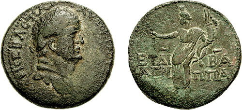 So full-hearted was Agrippa in carrying out Titus' wishes, that he was granted new territories after the war. Indeed, he played a key role in getting Vespasian and Titus on the throne. Titus specifically conscripted his help to get his dad on the throne. So this is just another way in which you see the demons of Judaism and Rome working hand in glove. For the past two hundred years there had been a controlling interest of Talmudism and the bankers with Rome. His dad, Herod Agrippa I had crowned a previous emperor, Claudius, and that crowning is recorded on coins.