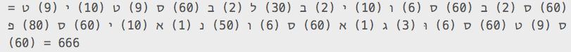 Hebrew of Titus Flavius Vespasianus Augustus = טיטס בלביוס בספסיאנוס אגוּסְטס= ט (9) י (10) ט (9) ס (60) ב (2) ל (30) ב (2) י (10) ו (6) ס (60) ב (2) ס (60) פ (80) ס (60) י (10) א (1) נ (50) ו (6) ס (60) א (1) ג (3) וּ (6) סְ (60) ט (9) ס (60) = 666