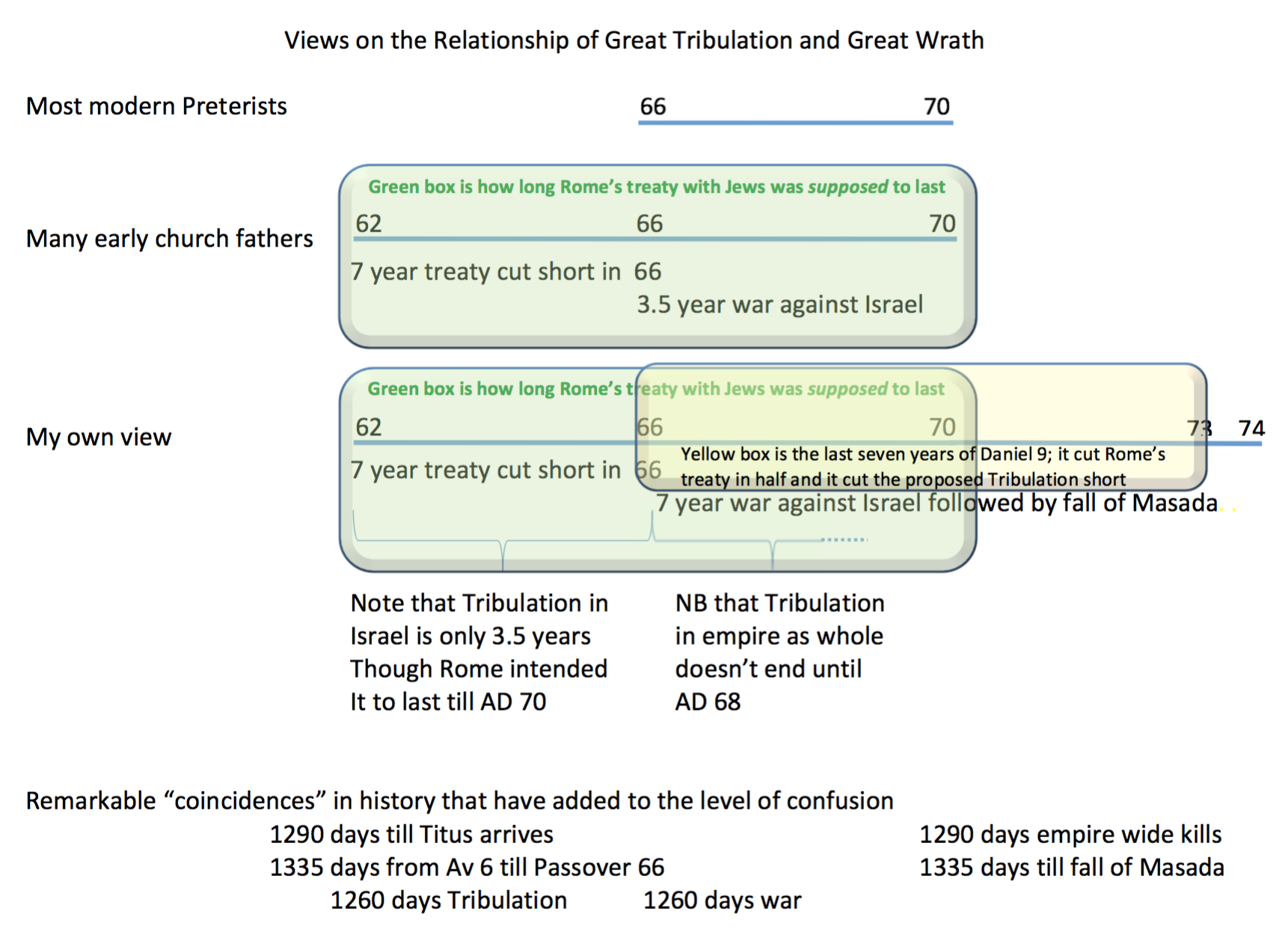 And I respect that opinion. I think it is wrong, but at least it understands that we have to account for seven years in both Daniel 11-12 and in the book of Revelation. Many modern preterists fail to see that. And what is particularly attractive about the viewpoint of those early church fathers is that there is a perfect and uncomplicated symmetry. It's much more simple than my view. It's what makes it attractive. On their view, the first half of the seven years was the Great Tribulation against Christians and the second half of the seven years was the war ending in the destruction of Jerusalem. And honestly, I wish their mapping out of the seven years would work because it is so simple and easy to explain.