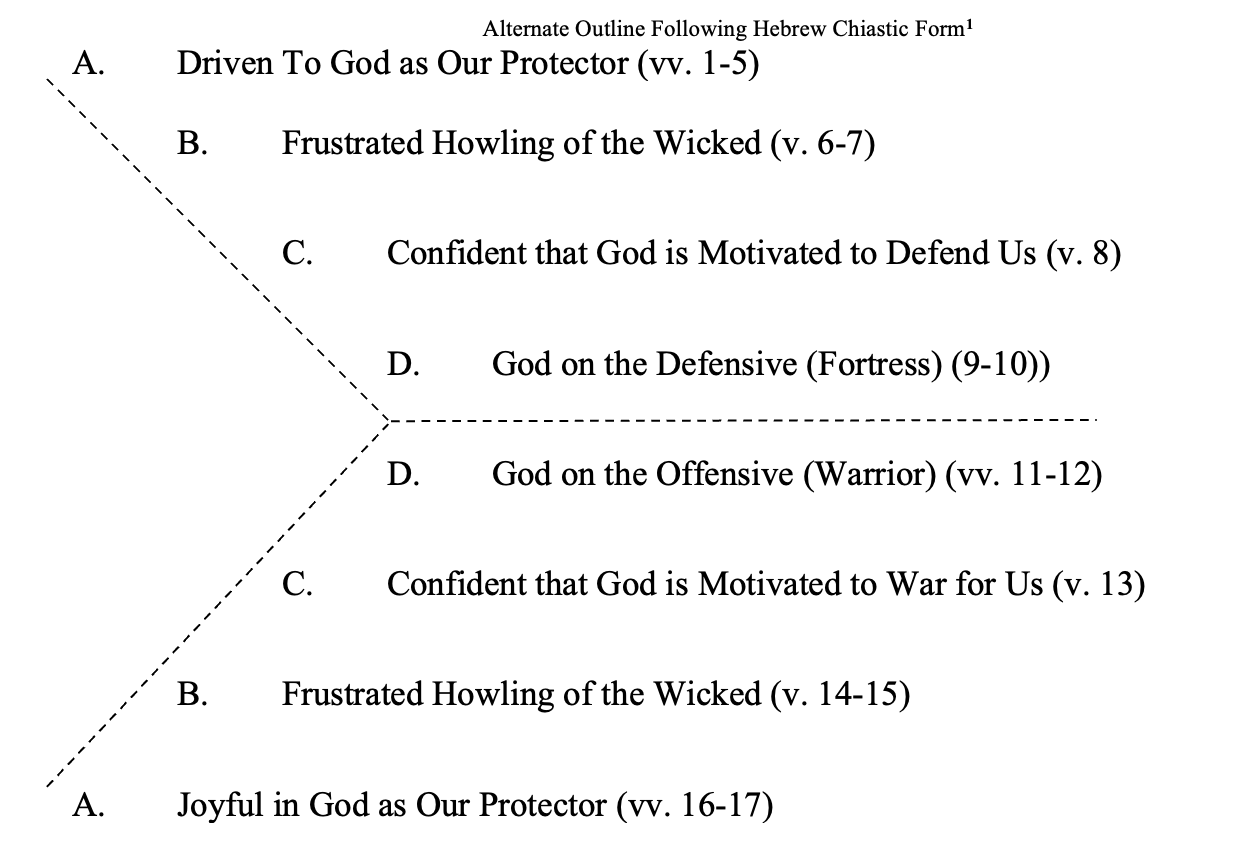 So in your outlines, verses 6-7 are parallel to verses 14-15. Both speak of the howling frustration of the wicked. Let me quickly read both sections so that you can see how the structure works. Verses 6-7: "At evening they return, they growl like a dog, and go all around the city. Indeed, they belch with their mouth; swords are in their lips; for they say, 'Who hears?'" Now look at verses 14-15. "At evening they return, they growl like a dog, and go all around the city. They wander up and down for food, and howl if they are not satisfied." There are slight differences in the parallels because the emphasis in the second half is offensive whereas the first half is defensive. But they are clearly parallel.