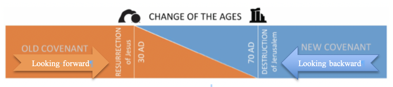 But let's move on to Trumpets. From AD 30 (when Pentecost happened) to AD 70 there was a forty-year transition period when Old Covenant and New Covenant operated side-by-side. Many scholars point out that there is an overlap. Hebrews said that the Old Covenant was growing old and was about ready to pass away. And I have put a diagram at the top of your outlines to illustrate that. We have seen in our studies of the Festivals during the Revelation series that the next two Festivals prophesy the end of Israel and the temple. And we saw that God providentially lined up these festivals to land precisely on corresponding days in covenant history.